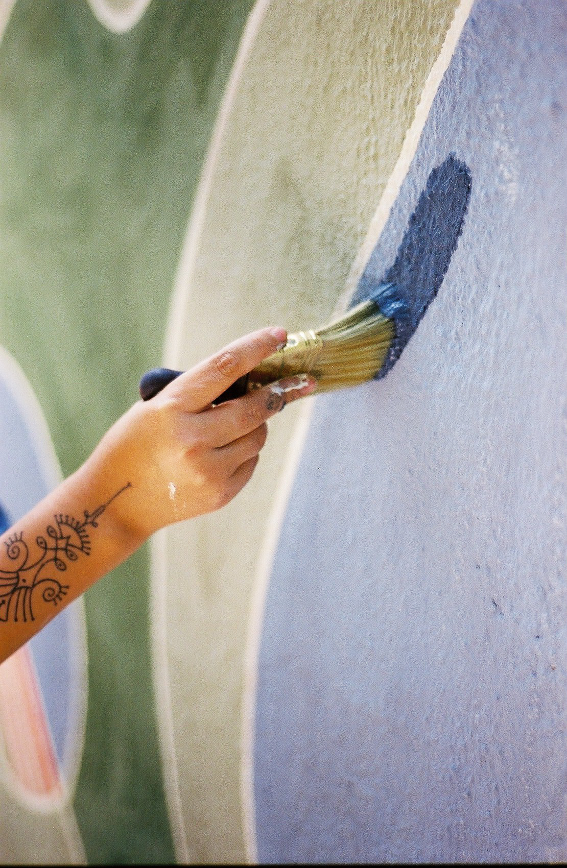 All the paint used on the mural is organic, it is made of clay and different minerals that are all natural to the Earth. All of the elements communicate belonging, community, connection, balance, collectivism and our ability to nurture and be nurtured. Fluidity is crucial in my design, it is key to the storytelling within my work. Creating connection between each element, cultivating a flow for the overall narrative to form the essense of the region into an art piece.