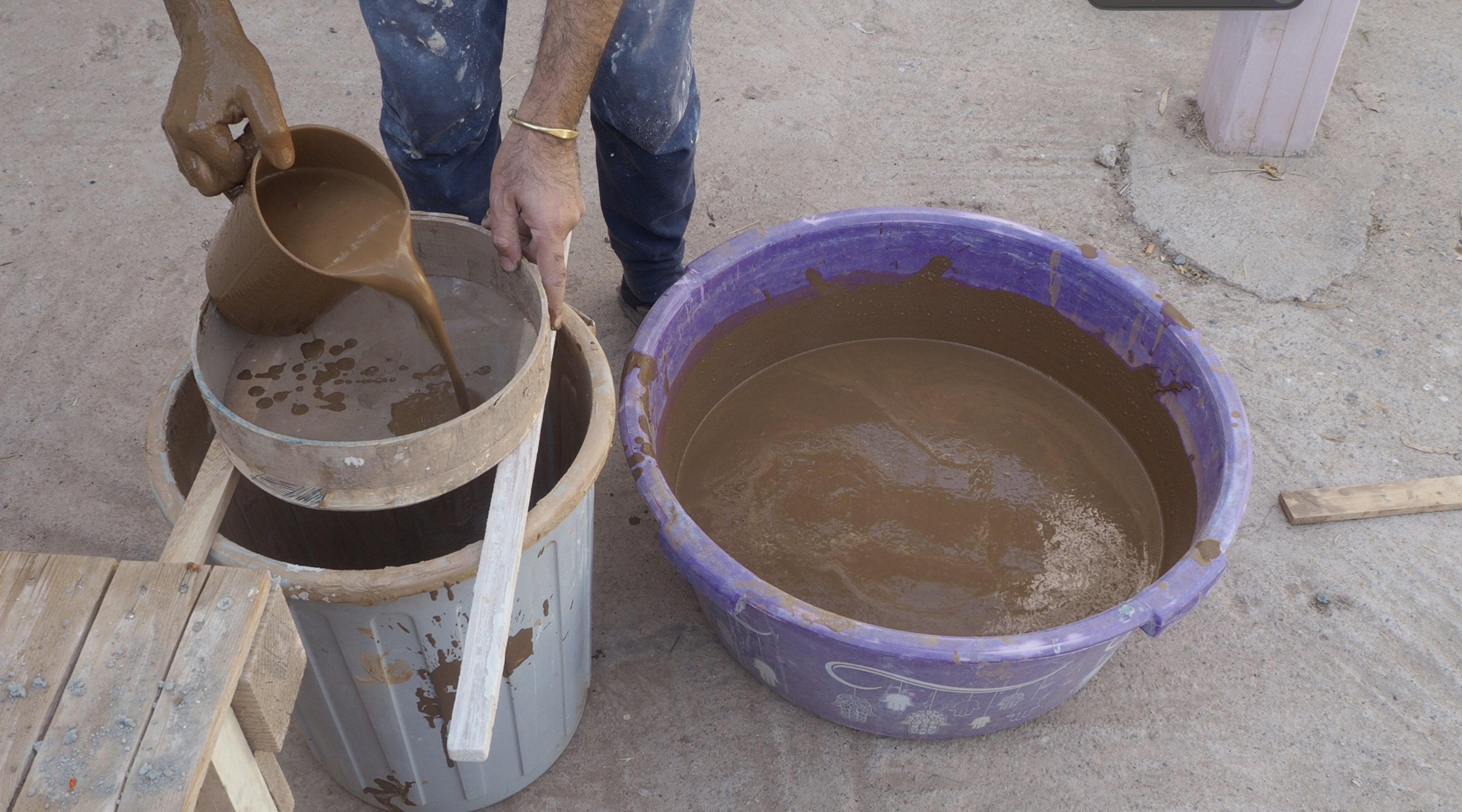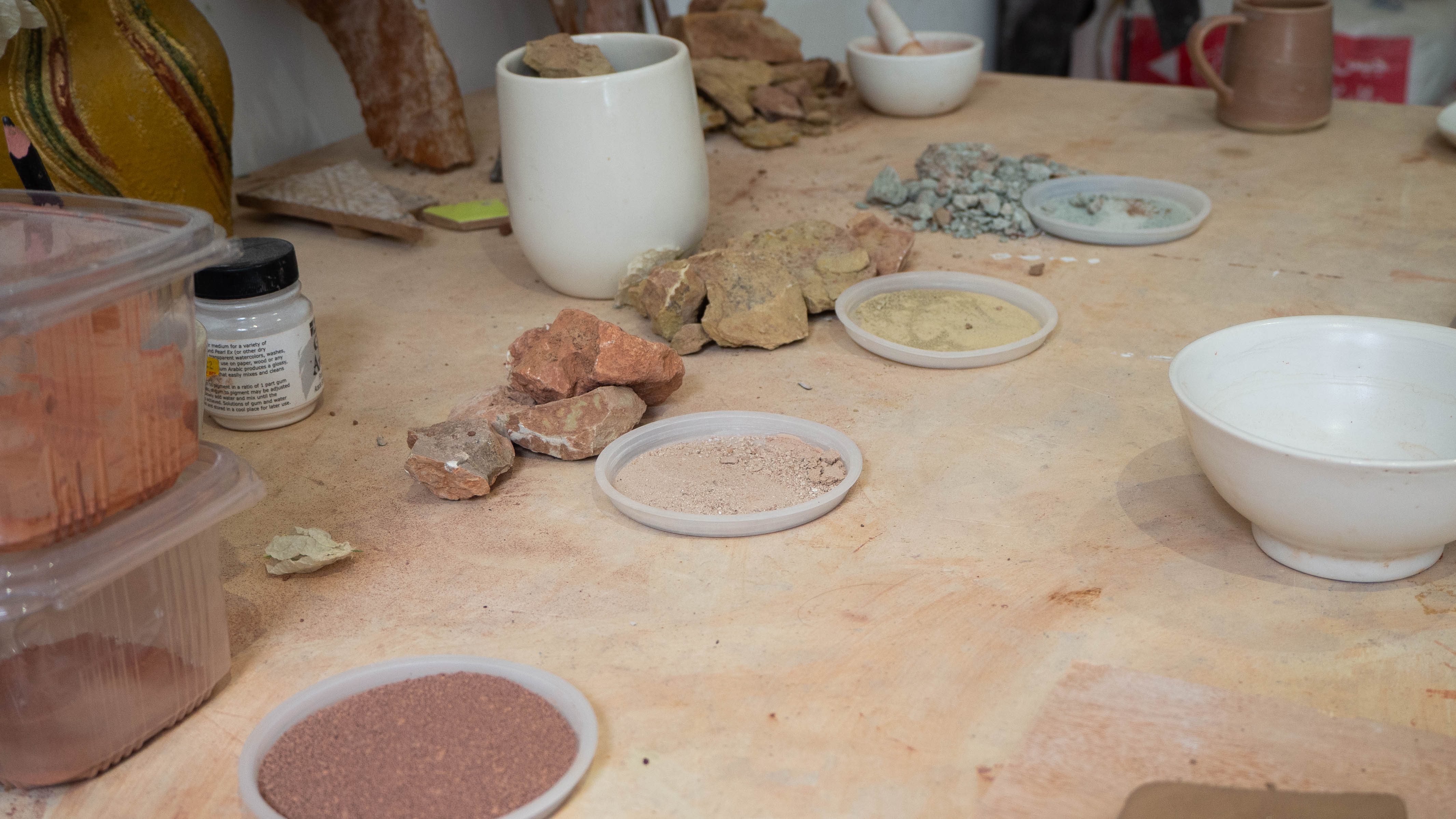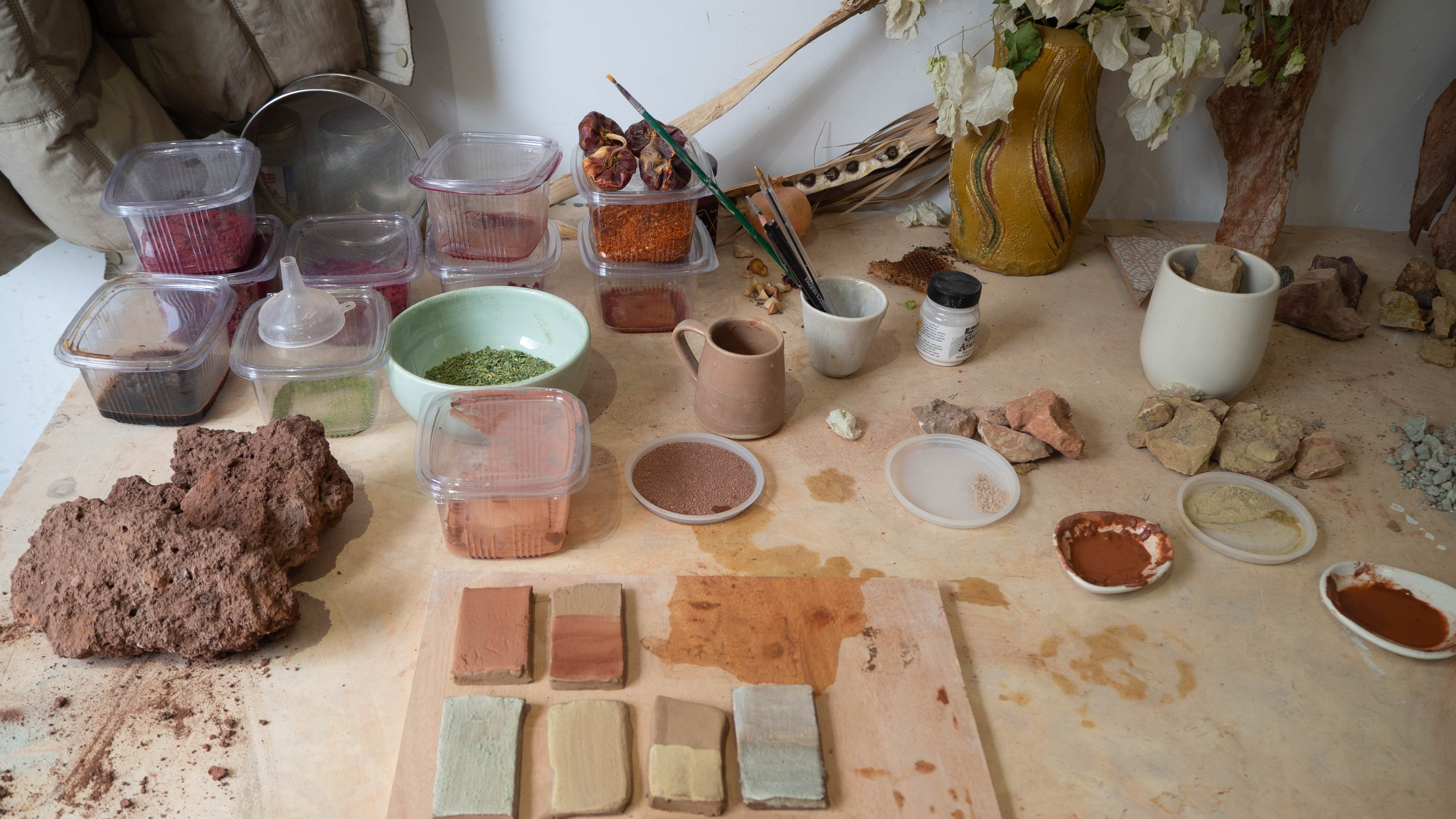 Alongside this material research, I shared time with local makers and craftspeople, learning through conversation, observation, and exchange. Trips to the Atlas Mountains expanded this inquiry, where I collected soils and minerals ranging from deep reds and purples to blues. These were transformed into pigments as a way of mapping and honouring the diversity of the landscape.